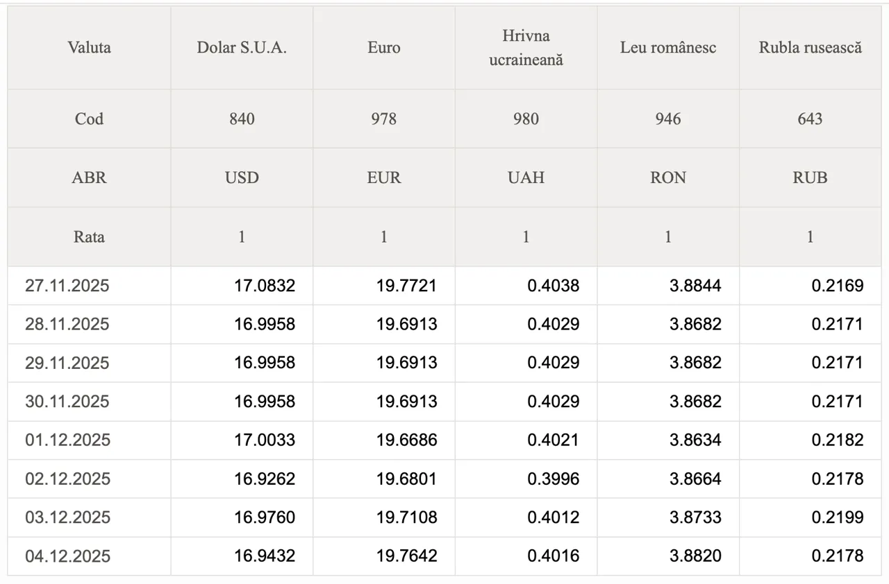 Astfel, un euro are valoarea de 19 lei și 76 de bani, transmite Ultimelestiri.md.