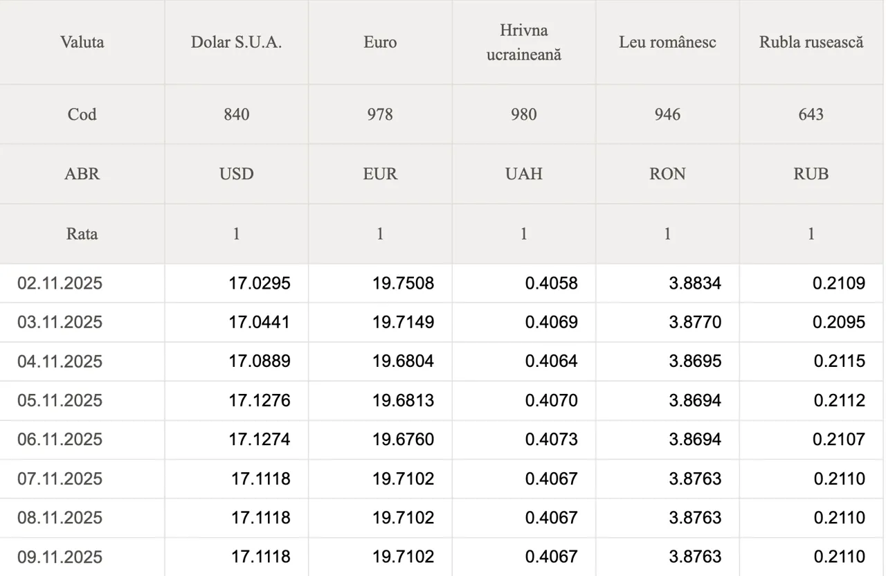 Astfel, un euro are valoarea de 19 lei și 71 de bani, transmite Ultimelestiri.md.