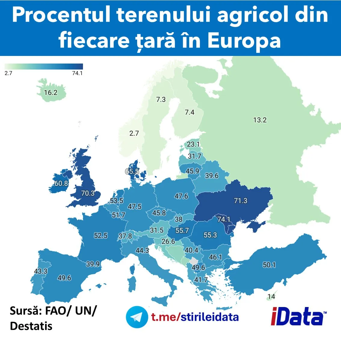 Pe poziția a doua se află Ucraina, cu aproximativ 71% teren agricol, în timp ce România înregistrează o pondere de aproximativ 55%, ceea ce înseamnă că mai mult de jumătate din suprafața țării este dedicată agriculturii, transmite Ultimelestiri.md.