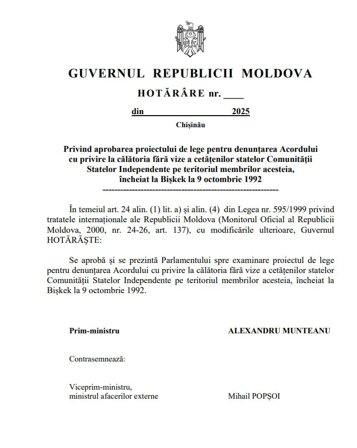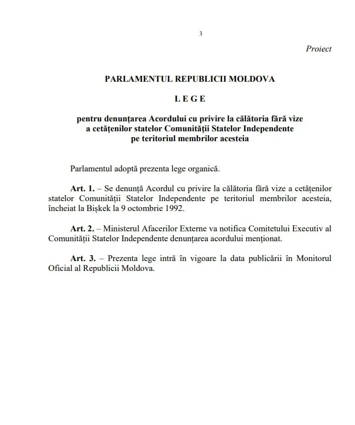 Astfel, se propune denunțarea Acordului cu privire la călătoria fără vize a cetățenilor statelor Comunității Statelor Independente (CSI) pe teritoriul membrilor acesteia, încheiat la Bișkek la 9 octombrie 1992. De asemenea, se propune denunțarea: Acordului privind principiile și ordinea efectuării transporturilor militare, încheiat la Tașkent la 15 mai 1992; Acordului privind principiile perceperii impozitelor indirecte la exportul și importul mărfurilor (lucrărilor, serviciilor) dintre statele participante la Comunitatea Statelor Independente, încheiat la Moscova, la 25 noiembrie 1998; Acordului privind cooperarea în domeniul chimiei şi petrochimiei, semnat la Moscova la 9 septembrie 1994; Acordului cu privire la colaborarea în domeniul utilizării gazelor naturale comprimate în calitate de combustibil pentru motoarele mijloacelor de transport auto, semnat la Minsk la 26 mai 1995; Acordului cu privire la colaborarea în domeniul ecologiei și protecției mediului natural ambiant, încheiat la Moscova la 8 februarie 1992, transmite Ultimelestiri.md cu referire la realitatea.md.