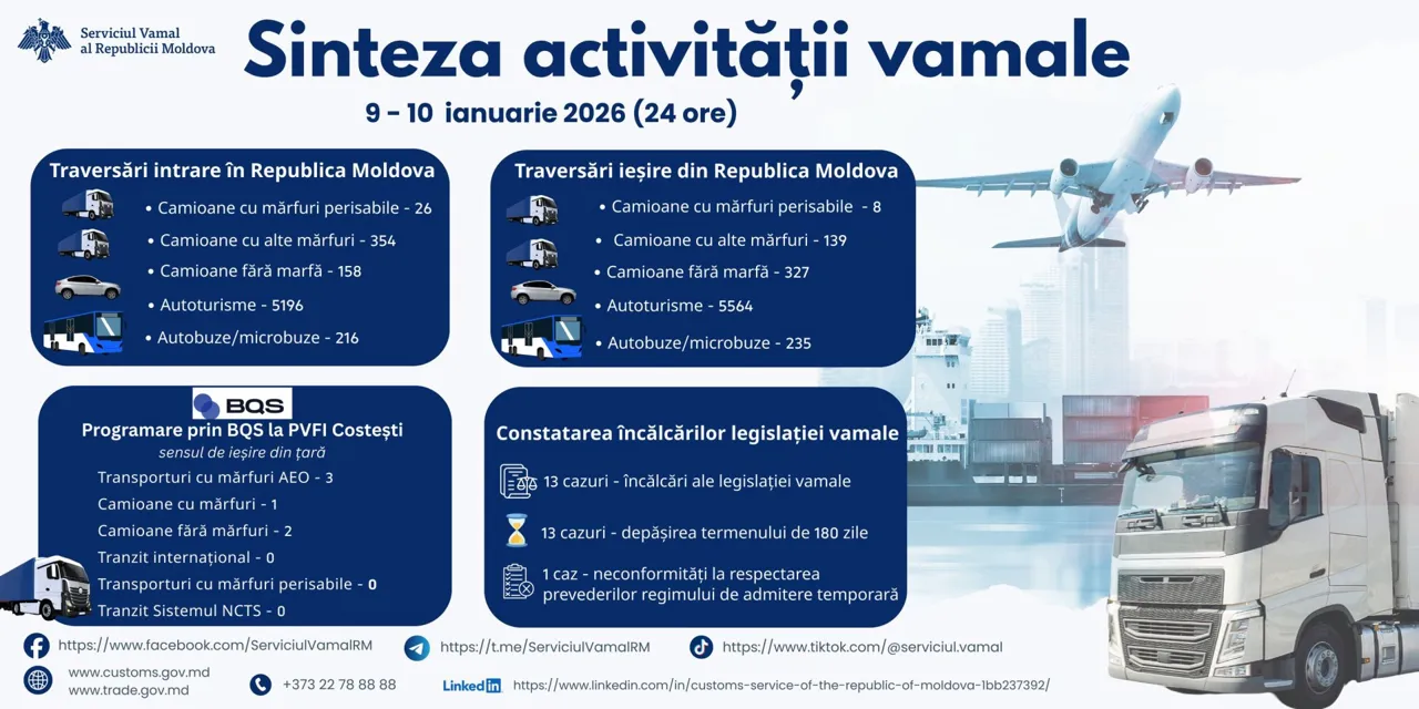 Pe sensul de ieșire din Republica Moldova, vameșii au procesat 8 camioane cu mărfuri perisabile; 139 de camioane cu alte mărfuri; 327 de camioane goale; 5.564 de autoturisme; 235 de autobuze și microbuze. Totodată, în perioada de referință, au fost programate prin sistemul BQS șase camioane la Postul Vamal de Frontieră Intern Costești, pe sensul de ieșire din țară.