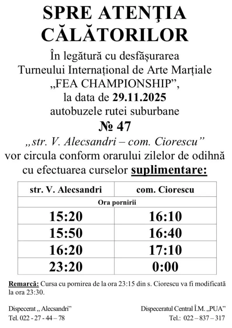 Pentru informații suplimentare puteți suna la Dispeceratul PUA: 022 837 317.