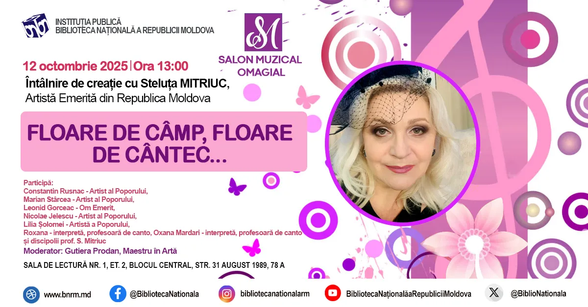 Sub titlul „Floare de câmp, floare de cântec”, evenimentul va omagia o viață dedicată muzicii, scenei și educației artistice, desfășurată cu pasiune și dăruire în inima Chișinăului, transmite Ultimelestiri.md.