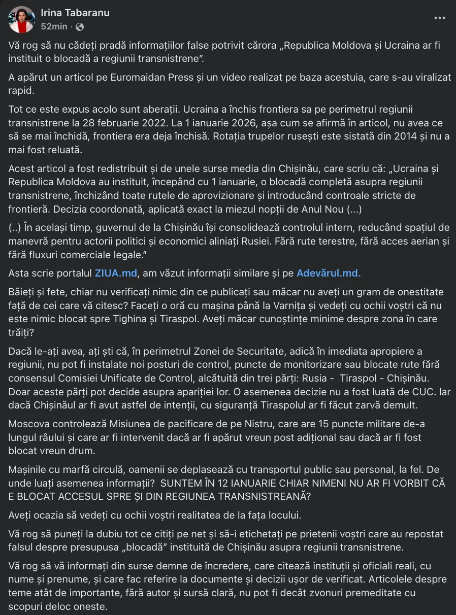 Ea precizează că Ucraina a închis frontiera sa pe perimetrul regiunii transnistrene încă la 28 februarie 2022. Pe data de 1 ianuarie 2026, invocată în articol, nu mai exista nimic ce ar fi putut fi „închis”, întrucât frontiera era deja închisă.