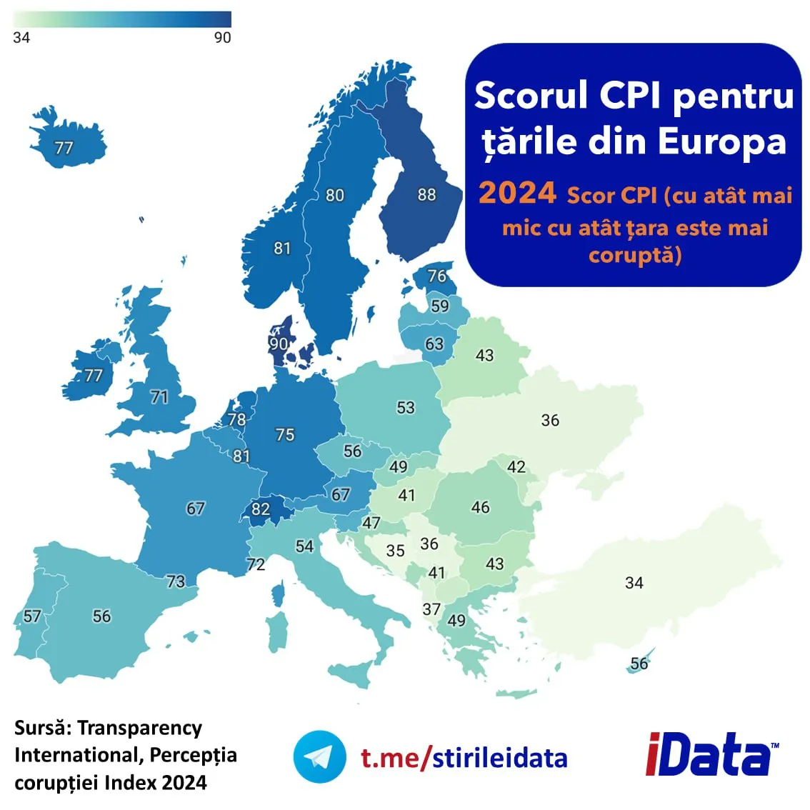 Potrivit datelor, Europa rămâne cea mai puțin coruptă regiune a lumii, însă diferențele între state sunt majore. Țările nordice – Danemarca (90), Finlanda (88) și Norvegia (81) – domină clasamentul, fiind considerate cele mai integre din punct de vedere al guvernanței și al funcționării instituțiilor publice, transmite Ultimelestiri.md.