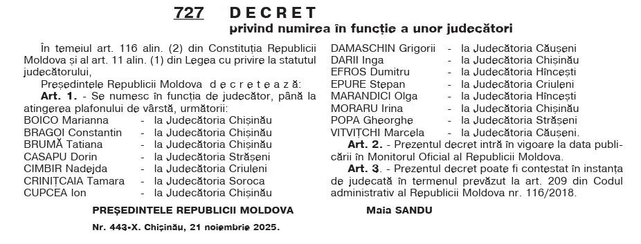 Potrivit decretului prezidențial, la Judecătoria Chișinău vor activa Marianna Boico, Constantin Bragoi, Nadejda Cimbir, Inga Darii, Irina Moraru, Marcela Vitvițchi, transmite Ultimelestiri.md cu referire la moldpres.md.