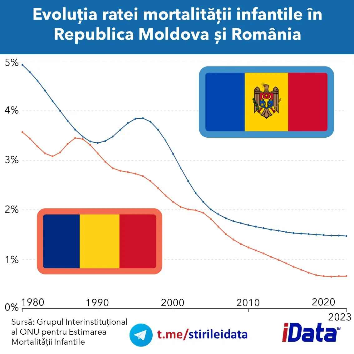 Comparativ, România pornea în anii ’80 de la un nivel mai scăzut, aproximativ 3–3,5%, și a reușit să accelereze reducerea după anul 2000. În 2023, rata mortalității infantile în România este estimată la circa 0,7–0,8%, sub nivelul înregistrat în Republica Moldova.
