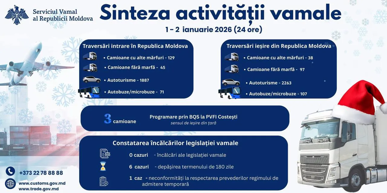 Totodată, în perioada de referință, trei camioane au fost programate prin sistemul BQS la Punctul de Vamă cu Facilități Interne Costești, pe sensul de ieșire din Republica Moldova.