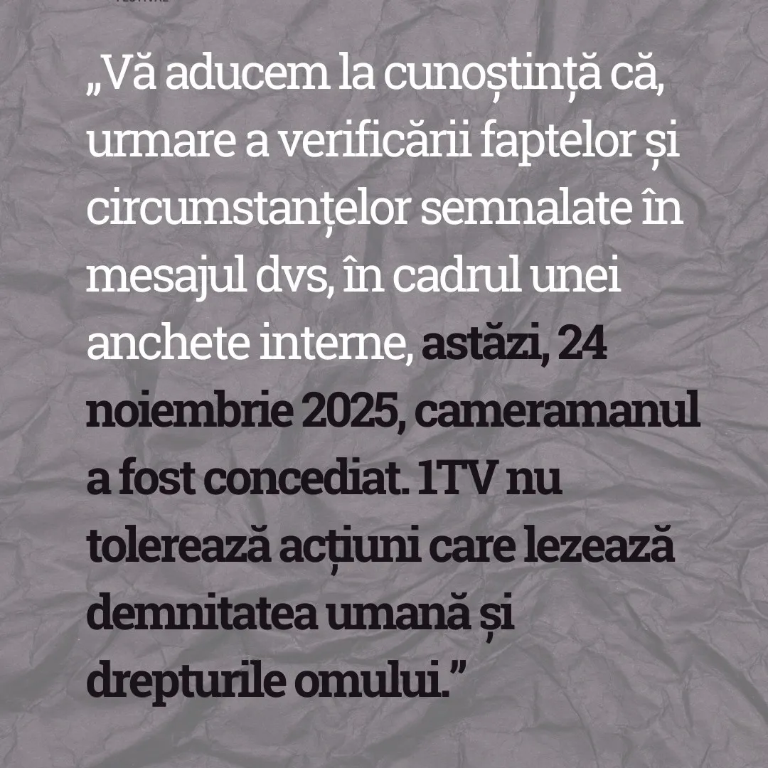 „Vă aducem la cunoștință că, în urma verificării faptelor și circumstanțelor semnalate, cameramanul a fost concediat. 1TV nu tolerează acțiuni care lezează demnitatea umană și drepturile omului”, se menționează în comunicat.