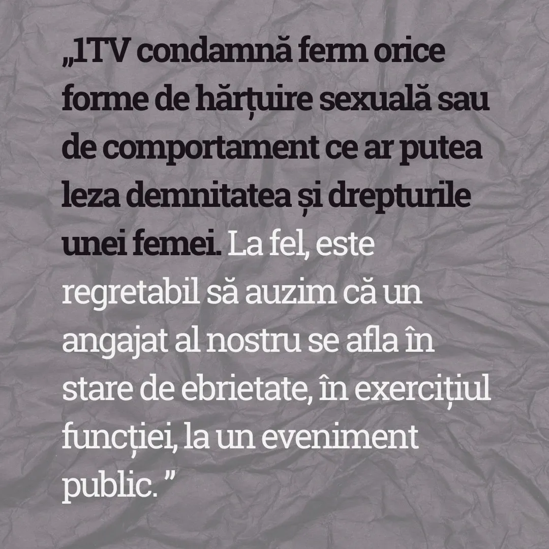 „Un astfel de comportament vine în contradicție clară cu valorile 1TV și Codul de etică al instituției noastre. 1TV condamnă ferm orice formă de hărțuire sexuală sau comportament ce ar putea leza demnitatea și drepturile unei femei”, se arată în reacția postului.