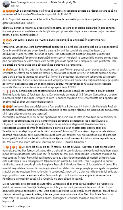 În opinia sa, modul în care a fost alcătuită echipa afectează credibilitatea sportului moldovenesc și transmite un mesaj greșit atât sportivilor autohtoni, cât și opiniei publice, într-un moment în care reprezentarea la Jocurile Olimpice ar trebui să fie un motiv de mândrie națională.